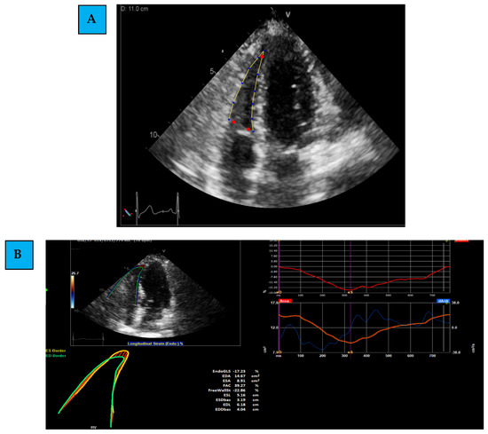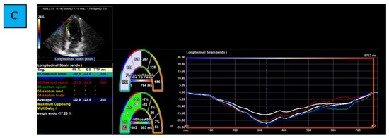 Medical history and treatment were collected from the electronic medical charts. Echocardiographic examinations were performed using the same protocol, personnel, and equipment (General Electric (GE) system, Haifa, Israel, model Vivid S70). LV echocardiographic measures included LV diameters, and LVEF [23]. TAPSE was measured as the distance of systolic excursion of the RV annular segment along its longitudinal plane, using M-mode from the apical 4C window [18]. Images were acquired using a high frame rate (>50 frames/s) [24]. LV GLS was measured using EchoPac STE software. LV boundaries were assessed at the end-systolic frame, which was first measured by automatic tracking and was later followed by performing manual corrections and optimization of images. We then performed offline measurements of RV 2D-STE by TOMTEC software, using the 2D PCA (cardiac performance analysis) application. The assessment included the following steps, as accepted by the most updated literature [25,26]: (Figure 1A–C)