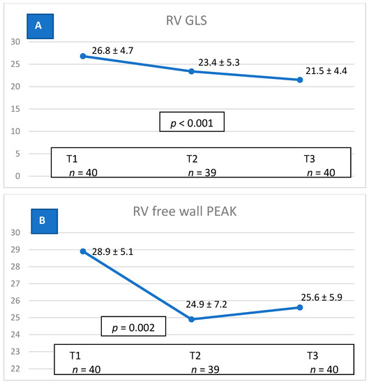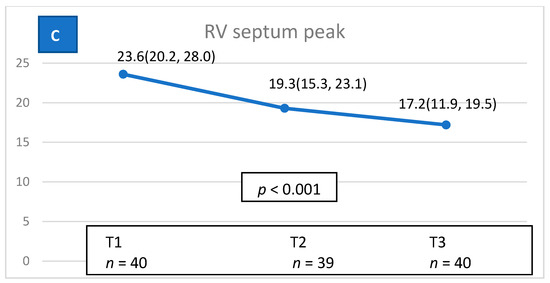 The mean RV GLS reduced significantly from −26.8 (±4.7)% at T1 to −21.5 (±4.4)% at T3 (p < 0.001). Both the mean RV FWLS PK and median RV GLS septum PK reduced significantly from −28.9 (±5.1)% at T1 to −25.6 (±5.9)% at T3 (p = 0.002) and from −23.6 (20.2, 28.0)% at T1 to −17.2 (11.9, 19.5)% at T3 (p < 0.001), respectively (Figure 2A–C). At T3, 30 (75%) and 23 (58%) patients showed a significant ≥ 10% relative reduction in RV GLS and RV FWLS PK, respectively. RV GLS and RV FWLS PK relative reduction of ≥ 15% was seen in 28 (70%) and 20 (50%) of the patients, respectively (Table 2).