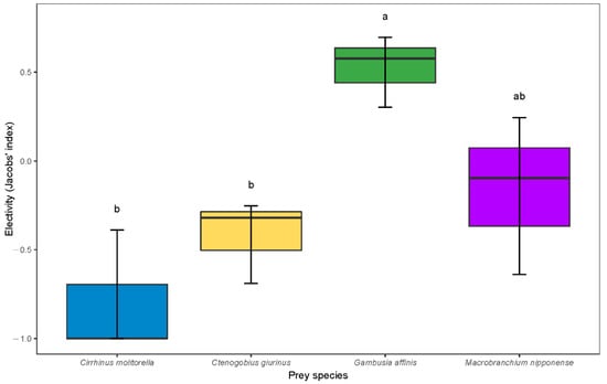 Boxplot showing predation preferences (Jacobs’ selectivity index) of juvenile largemouth bass on various prey species. Representing 50% of the central data, the box in the boxplot starts in the first quartile (25%) and ends in the third (75%), with a line inside that represents the median. Significant differences between the means are indicated by superscript letters. If two variables in the same row have the same superscript letter, the difference between the means is not statistically significant.