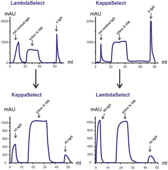 We developed and published a method for the isolation of bispecific antibodies (bsAbs) from human milk [43], blood [37], and placenta [44]. Here, the preparations of κκ-IgG, λλ-IgG, and bispecific κλ-IgG Abs were isolated from IgG using affinity chromatography on columns which bind explicitly human light chains of the kappa type (KappaSelect, GE Life Sciences) and lambda type (LambdaSelect, GE Life Sciences). KappaSelect bound κκ- and κλ -IgG, while LambdaSelect bound λλ- and κλ-IgG. IgG fraction with an affinity for KappaSelect was rechromatographed on LambdaSelect and vice versa (Figure 2). The κλ-IgG subfraction, with an affinity for KappaSelect, also binds to LambdaSelect and vice versa. Thus, κλ-IgG subfractions were eluted with acid buffer both from LambdaSelect and KappaSelect on repeated chromatography, while κκ-IgG and λλ-IgG were obtained in-flow during second chromatography. The exact mechanism generation of κλ-IgG in the blood is unknown, but we suppose that these bsAbs are generated due to the Fab arms exchange described in [45,46]. However, at present, the mechanism of this process is described in detail only for IgG4 [47].