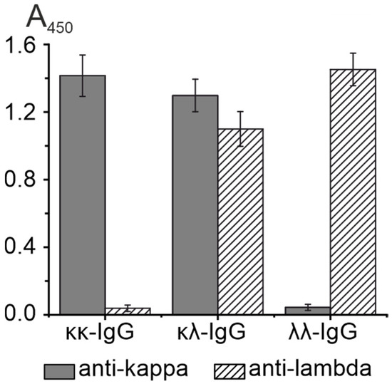 Aliquots of 100 μL primary Abs (anti-kappa K-4377, anti-lambda L-6522, both from Sigma, St. Louis, MO, USA), with a final concentration of 1 μg/mL, were dissolved in 0.1 M carbonate–bicarbonate buffer (0.1 M NaHCO3, 0.1 M Na2CO3), and incubated overnight at 4 °C in wells of ELISA strips with a high binding surface (Corning, Tewksbury, MA, USA). Surface of wells was blocked by adding 200 μL of 5% skimmed milk powder (Applichem, Darmstadt, Germany) in TBST, incubated for 60 min at 37 °C on a shaker incubator (Biosan, Riga, Latvia). Blocking solutions were removed out of the wells and washed with 200 μL of TBST three times each. Preparations of analyzed IgG with 0.1 mg/mL concentration were diluted ten times with TBS and added in 100 μL per well. ELISA plates were incubated for 1 h at 37 °C on a shaker incubator. Aliquotes of 100 μL of secondary Abs conjugated to horseradish peroxidase were diluted according to the manufacturer’s instructions (anti-kappa A-7164 20,000 times, anti-lambda A-5175 20,000 times, both from Sigma, St. Louis, MO, USA) in TBST and incubated for 1 h at 37 °C shaker incubator. Solutions were removed out of the wells and washed with 200 μL of TBST three times. Then, the wells were filled with 100 μL of the substrate (5 mL of citrate-phosphate buffer pH 5, 12 μL of 30% hydrogen peroxide, 5 mL of distilled water, 715 μL of 5 mg/mL TMB solution in DMSO). After 15 min, the reaction was stopped by adding 50 μL of 1 M sulfuric acid. Optical density was measured on a Multiskan FC spectrophotometer (Thermo Scientific, Waltham, MA, USA) in a two-wave mode, with a primary filter of 450 nm and a reference filter of 620 nm. Results were presented as the average of a series of three independent experiments.