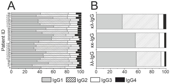 IgG1–4 subclasses were tested in the κκ-IgG, λλ-IgG, and κλ-IgG subfractions (Figure 4B). The contents of κκ-IgG subclasses were IgG1 (55.8%) > IgG2 (34.2%) > IgG3 (7.4%) > IgG4 (2.6%); for λλ-IgG, they were IgG1 (57.1%) > IgG2 (35.5%) > IgG3 (5.0%) > IgG4 (2.3%); and for bispecific κλ-IgG, they were IgG2 (51.5%) > IgG1 (37.1%) > IgG3 (7.5%) > IgG4 (3.9%). Thus, the κλ-IgG was presented with all IgG1–4 subclasses (as in the case of the IgG of human blood, placenta, and milk [37,44,51]). Moreover, IgG1 prevailed in the κκ-IgG and λλ-IgG subfractions, and IgG2 in case of κλ-IgG subfractions. Raw data are given in Table S3.