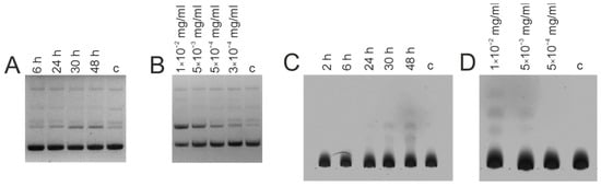 Hydrolysis of pBluescript plasmid DNA (A) and maltoheptaose (B) by DNase I (A) and Bacillus sp. α-amylase (B) at various final concentrations after incubation for 48 h at 37 °C; c—control samples incubated without enzymes. One unit of enzyme activity of DNase I according to the supplier instruction completely degrades 1 μg of plasmid DNA in 10 min at 37 °C (EN0525, Thermo Waltham MA, USA); 1 U of α-amylase from Bacillus sp. (A6380, Sigma, St. Louis, MO, USA) liberates 1 mg of maltose from starch in 3 min at pH 6.9 at 20 °C.