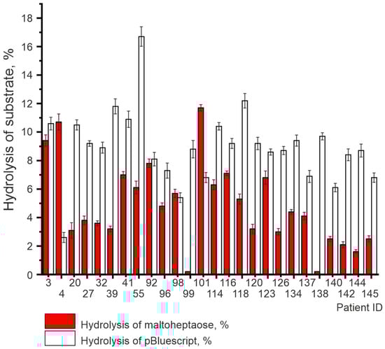 As one can see from Table A1, the differences in specific DNase activity varies in six orders of magnitude: from 10−19 to 10−13 U/mg of IgG, depending on the patient ID. On the contrary, the detectable amylolytic activity ranges in less than two orders: from 10−9 to 10−8 U/mg.