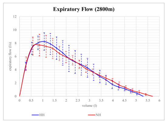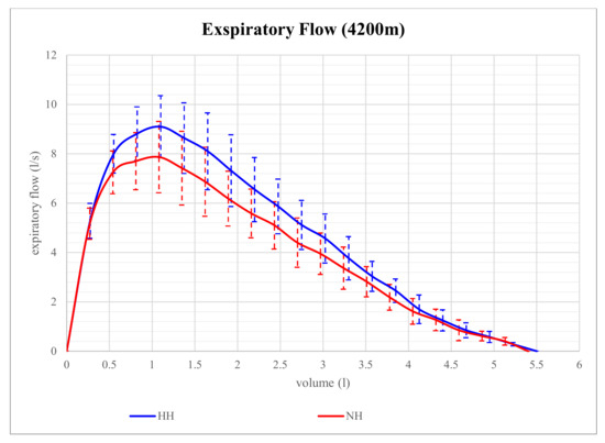 Expiratory flow volume in NH and HH at 2800 m is shown in Figure 1. Although expiratory flow volume seems to be higher in HH than in NH at that level of altitude, the differences in parameters of expiratory flow between NH and HH were not significant. However, at 4200 m, expiratory flow volume proved to be significantly different and is shown in Figure 2. At that altitude level, significant differences between NH and HH were found in PEF, MEF75, and MEF50. PEF was 13.4% higher in HH than in NH (p = 0.028), MEF75 was 16.2% higher in HH than in NH (p = 0.028), and MEF50 was 15.9% higher in HH than in NH (p = 0.046). No significant differences between NH and HH were found in FEV1 at 2800 m (p = 0.496) as well as at 4200 m (p = 0.249). FVC did also not show any significant differences between NH and HH at 2800 m (p = 0.173) as well as at 4200 m (p = 0.6).