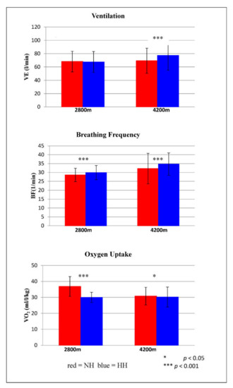 Ventilatory parameters during submaximal exercise testing are shown in Figure 3. VE differed significantly at 4200 m (p < 0.001). On average, VE was 11.5% higher in HH than in NH. BF showed significant differences at 2800 m (p < 0.001) and at 4200 m (p = 0.001). At 2800 m, BF was on average 4.3% lower in NH than in HH, and at 4200 m, BF was on average 7.8% higher in HH than in NH. VO2 also differed significantly at both altitude levels. At 2800 m, VO2 was on average 23% higher in NH than in HH (p < 0.001), and at 4200 m, VO2 was on average 2% higher in NH than in HH (p = 0.029).