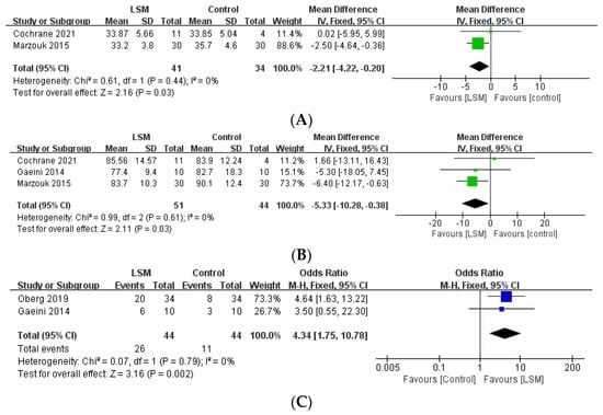 Forest plot for the meta-analysis of lifestyle modification, compared to controls. (A) BMI. (B) Weight. (C) Improved menstrual cycle. (CI: confidence interval, LSM: lifestyle modification, SD: standard deviation.)