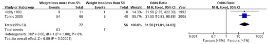 This study performed a meta-analysis of data pertaining to improvements in reproductive function (Figure 5). The number of patients with improved reproductive function was significantly higher in the group that achieved weight loss of 5% or more compared to the subjects who achieved less than 5% weight loss (OR: 31.50, 95% CI: 11.81 to 84.02, p < 0.00001, I2 = 0%).