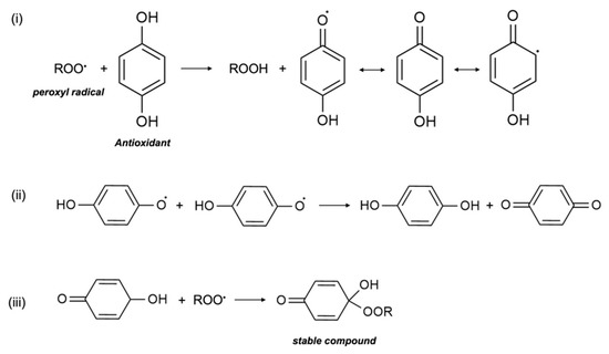 Termination of free radicals by antioxidants. The peroxyl radical is scavenged by antioxidants e.g., α-tocopherol. The resulting metabolite either (i) stabilizes itself, (ii) combines with another similar metabolite, or (iii) scavenges another peroxyl radical.