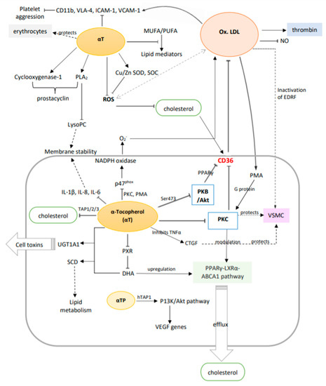 Furthermore, oxidized LDL also activates enzyme protein kinase B (PKB/Akt) in VSMC. PKB/Akt is a major enzyme responsible for controlling various cellular processes such as cell migration, cell apoptosis, gene expression, lipid metabolism, free radical production, etc. [7]. During atherosclerotic plaque formation, increased PKB/Akt levels have been observed. Vitamin E inhibits the phosphorylation of Ser473, the key regulatory site of PKB/Akt, and subsequently regulates the production of the PKB enzyme (independent of PKC regulation). Moreover, vitamin E decreases oxidized LDL uptake by THP-1 macrophages by preventing oxidized LDL-induced Ser473 phosphorylation. This further downregulates CD36 scavenger receptors via PPAR in the ox-LDL/CD36/PKB/PPARγ pathway. As a result, it decreases overall lipid uptake and biosynthesis in cells [59]. Cholesterol biosynthesis and lipid exchange is also prevented by the binding of αT to tocopherol-associated proteins (TAP 1/2/3), which inhibit enzymes squalene epoxidase and HMG-CoA reductase [60].