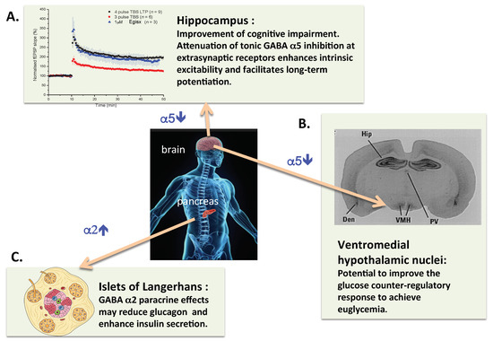 Schematic representation of the potential therapeutic benefits of treatment of insulin-dependent diabetic patients with a combination of an α2-GABAA enhancer and an α5-GABAA inhibitor compound. (A) It is well established in preclinical models that inhibitors of α5-GABAA-R facilitate hippocampal synaptic plasticity and can improve impairment of learning and memory. (B) In addition to the hippocampus, the hypothalamic ventromedial nuclei stand out with high levels of α5-GABAA binding sites in rat brain [86]. This has been confirmed by mRNA in situ hybridization in human brain. Thus it is justified to hypothesize that inhibition of α5-GABAA-R could reduce the GABAergic impairment of the glucose counterregulatory response in insulin-dependent diabetics. (C) The insulinotrophic effects of GABA appear to be mediated by α2-GABAA-R, thus an α2-GABAA PAM could improve pancreatic islet beta cell function. Finally, it is of note that compounds with dual, α2-GABAA enhancer and α5-GABAA inhibitor activity have been produced [72].