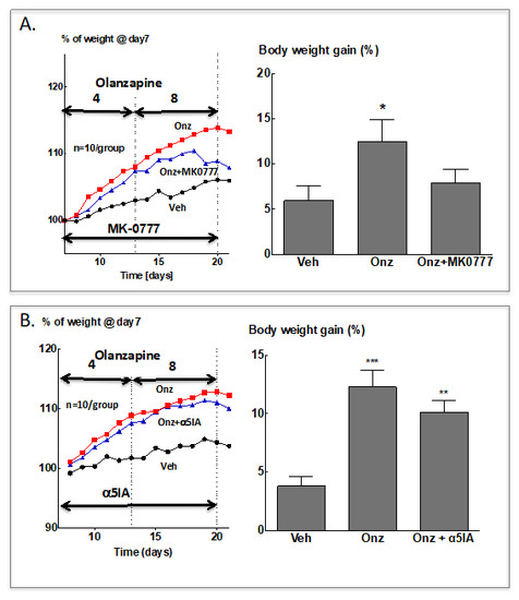 Thus, further exploration of the effects of MK-0777 or further α2/α3-GABAA PAMs on olanzapine-induced weight gain appears warranted. An adjuvant therapy achieving α2-GABA enhancement as well as α5-GABA inhibition could be also advantageous, as olanzapine-induced weight gain, and disturbances of plasma glucose regulation, as well as cognitive deficits associated with schizophrenia [126] may be all improved.