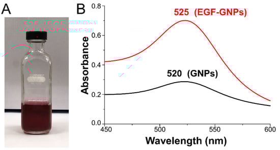 To determine whether EGF was coupled with GNPs, we analyzed GNPs and EGF–GNPs solutions with UV–Vis spectroscopy as described previously [11,12]. Briefly, 200 µL of each solution was added to the cell of the UV–Vis equipment (Varian Cary 5000 UV–Vis-NIR, Agilent Technologies, Santa Clara, CA, USA), then each solution was diluted in 800 µL of deionized water until cell was filled. All samples were analyzed in the absorption range of 200–800 nm.