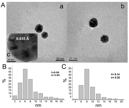 Non-spherical morphologies may represent an inconvenience for administrating nanoparticles into a tissue [17]. Furthermore, GNPs are chemically inert when their sizes are larger than 3 nm [18]. To determine the size and morphology of our GNPs as well as that of the EGF–GNPs, we used TEM. In all the samples analyzed, we observed that our GNPs had a spherical morphology (Figure 2A). The mean size of the uncoupled nanoparticles was 8.09 ± 3.60 nm and that of the EGF–GNPs nanocomposite was 9.14 ± 5.28 nm in diameter (Figure 2B,C). The interplanar distance of GNPs was 0.835 Å (Figure 2A, insert c), which indicates that GNPs have a crystalline structure typically found in gold-containing solutions. These findings indicate that GNPs are chemically inert and have a spherical morphology.