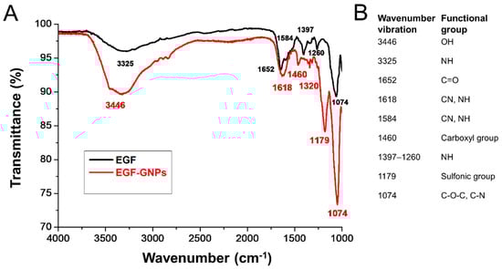 To determine that the molecule of EGF is not affected by the coupling with GNPs, we carried out a FTIR analysis. In all our samples, we found nine absorption bands in the infrared spectrum, a physicochemical characteristic of EGF [19,20] (Figure 3). The black band in the infrared spectrum corresponds to the uncoupled EGF (Figure 3A); each wavenumber vibration in the spectrum represents a functional group of the EGF. The red band in the infrared spectrum corresponds to the EGF coupled to the GNPs (Figure 3A). Our data indicate that EGF alone and EGF–GNPs showed the same functional groups. This evidence indicates that EGF molecules are not affected by the coupling with GNPs.