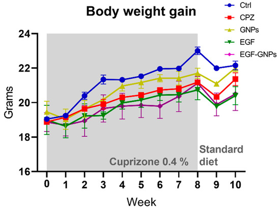 To promote demyelination, we used a known administration model of 0.4% cuprizone mixed with standard food [10]. Subsequently, the body weight gain was monitored every week for 8 weeks. In our study, we found that the mice that did not receive cuprizone in their food had a greater weight gain, compared to those who were treated with 0.4% cuprizone. Moderate weight loss is a common feature in the cuprizone model, which in no case leads to malnutrition or the general development of the subjects being compromised, as previously reported in other studies [21,22,23].