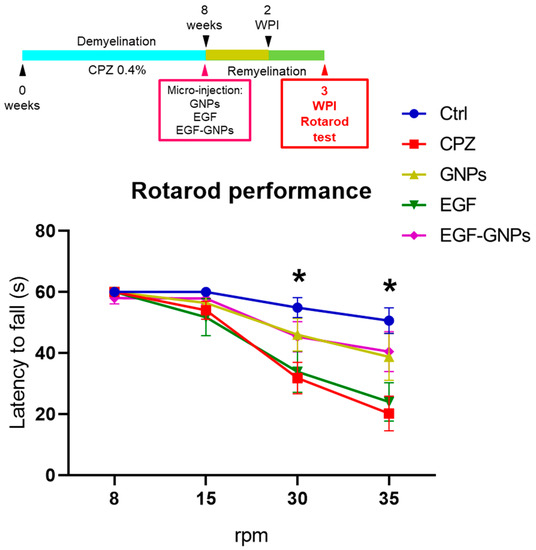Motor coordination. Motor coordination was assessed at 3 WPI. Differences in motor performance were more evident with the rotor speeds of 30 and 35 rpm. Ctrl (n = 10), CPZ (n = 12), GNPs (n = 8), EGF (n = 8) and EGF–GNPs (n = 8). Data are expressed as the mean ± SE. * p ≤ 0.05; Kruskal–Wallis test with Bonferroni correction. At 30 rpm speed, asterisks indicate differences between the Ctrl vs. CPZ (p = 0.003) and EGF (p = 0.010). At 35 rpm speed, Ctrl vs. CPZ (p = 0.001) and EGF (p = 0.005).