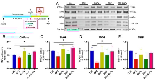 Myelin protein expression in the septal nucleus at 2 weeks post-injection. (A) Two representative images of Western blot of myelin-associated protein expressions per group. (B) CNPase expression was increased in the EGF–GNPs group with respect to the Ctrl, CPZ, and EGF groups. (C) MAG expression was also elevated in the EGF–GNPs group compared to the Ctrl and CPZ groups. (D) MOG expression show differences between EGF–GNPs vs. GNPs group and Ctrl vs. GNPs group. (E) MBP expression did not show statistically significant differences among all groups. All procedures were processed by duplicate; n = 3 mice per group. Data are expressed as the mean ± SE. Mann–Whitney U test, * p ≤ 0.05.