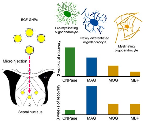 Representative scheme of the EGF–GNPs effect on the expression of myelin-associated proteins in the septal nucleus. Two weeks after the injection of EGF–GNPs, the most abundant protein is CNPase, a marker of pre-myelinating OLs, followed by MAG (a marker of newly differentiated OLs) and MOG (marker of myelinating OLs). At the 3rd week after EGF–GNPs administration, CNPase levels tend to normalize, whereas the MAG, MOG, and MBP expression increases. These findings suggest that EGF–GNPs facilitates the remyelination process.