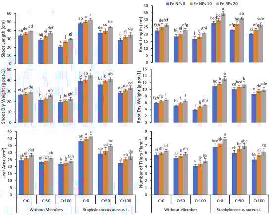 Combined effects of Fe nanoparticles (NPs) (0, 10, and 20 mg L−1) and S. aureus L. on growth parameters of rice grown under Cr stress (0, 50, and 100 mg kg−1). The mean values of three replicates together with their standard deviation are shown in the plots. Various small letters denote significant differences between different treatments at p ≤ 0.05.