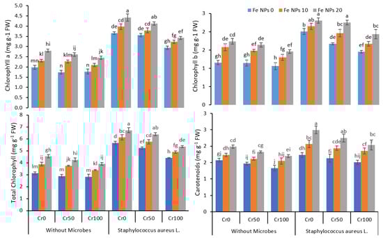 Combined effects of Fe nanoparticles (NPs) (0, 10, and 20 mg L−1) and S. aureus L. on chlorophyll and carotenoids of rice grown under Cr stress (0, 50, and 100 mg kg−1). The mean values of three replicates together with their standard deviation are shown in the figure. Various small letters denote significant differences between different treatments at p ≤ 0.05.