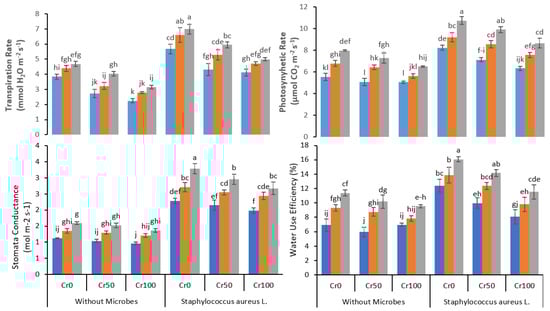 Combined effects of Fe NPs (0, 10, and 20 mg L−1) and S. aureus on gas exchange attributes of rice grown under Cr stress (0, 50, and 100 mg kg−1). The mean values of three replicates together with their standard deviation are shown in figure. Various small letters denote significant differences between different treatments at p ≤ 0.05.