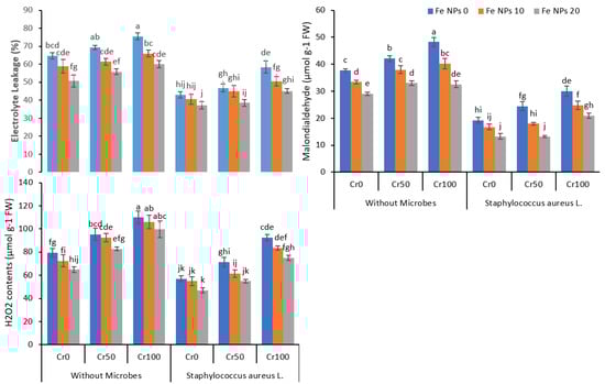 Combined effects of Fe NPs (0, 10, and 20 mg L−1) and S. aureus on oxidative stress indicating parameters of rice grown under Cr stress (0, 50, and 100 mg kg−1). Mean values of three replicates together with its standard deviation are shown in the figure. Various small letters denote significant differences between different treatments at p ≤ 0.05.
