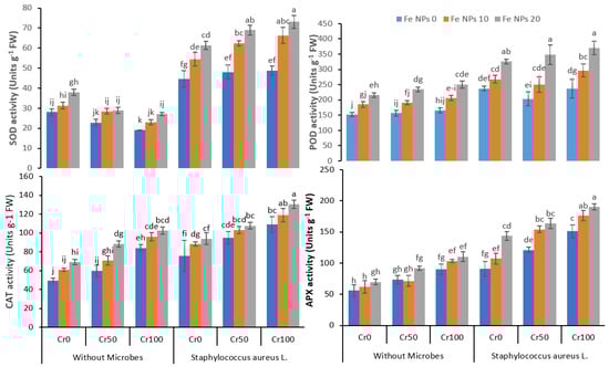 Combined effects of Fe NPs (0, 10, and 20 mg L−1) and S. aureus L. on antioxidants enzymatic activities of rice grown under Cr stress (0, 50, and 100 mg kg−1). The mean values of three replicates together with their standard deviation are shown in the figure. Various small letters denote significant differences between different treatments at p ≤ 0.05.