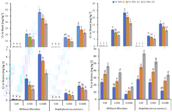 The data regarding chromium accumulation in the root, shoot, and grains and Fe accumulation in grains are shown in Figure 6. The increasing chromium concentration from 0 to 100 mg kg−1 also increased the chromium accumulation in the root, shoot, and grains in treatments without Fe NPs and bacterial inoculation. The combined application of Fe NPs and S. aureus L. significantly reduced the Cr uptake and accumulation in the plants. On the other hand, the increasing concentration of Cr from 0 to 100 mg kg−1 reduced the iron accumulation despite increasing Fe NPs concentration from 0 to 20 mg kg−1 both in non-inoculated and inoculated rice plants.