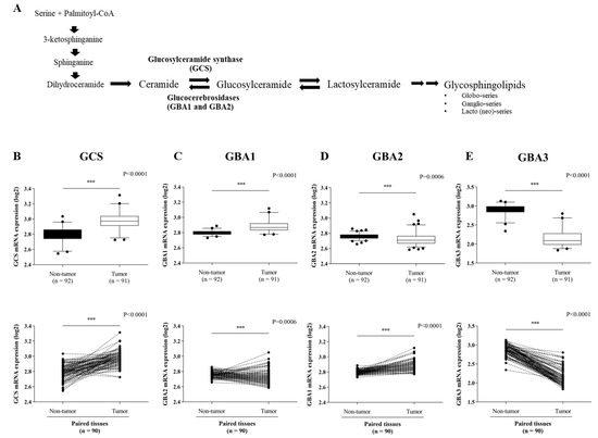 Expression of ceramide-metabolizing enzymes in paired CCA tissues. (A) Diagram of the sphingolipids biosynthesis pathways. Expression data were obtained from the GEO database (GSE76297 dataset) for a comparison of: (B) GCS mRNA expression, (C) GBA1 mRNA expression, (D) GBA2 mRNA expression and (E) GBA3 mRNA expression. The Mann-Whitney was used to compare the expression between tumor (n = 92) and non-tumor tissues (n = 91) as well as paired tissues. ***, p < 0.001 versus non-tumor tissues.