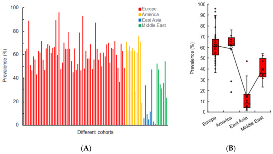 Figure 1A shows the prevalence of early gustatory dysfunction in different COVID-19 cohorts. The prevalence depended on geographical differences between Europe, America, East Asia, and the Middle East (Figure 1B). Pooled prevalence (mean ± SD) was 61.8 ± 12.9% in Europe (Italy, France, Spain, Germany, Switzerland, the UK, Denmark, Sweden, and Poland), 59.1 ± 17.3% in America (the USA and Canada), 14.4 ± 15.7% in East Asia (China, Japan, South Korea, and Singapore) and 39.8 ± 10.7% in the Middle East (Iran, Israel, Turkey, and Qatar). Early gustatory dysfunction in COVID-19 patients is likely to be more prevalent in East Asian cohorts than in European cohorts (p < 0.0001), American cohorts (p < 0.0001), and Middle Eastern cohorts (p < 0.01), whereas there were no significant differences between European, American, and Middle Eastern cohorts. Cirillo et al. [113] indicated that COVID-19 patients exhibit a geographically different pattern of gustatory dysfunction. A comparative study by Kumar et al. [114] also revealed that COVID-19 patients presenting with ageusia show significantly lower percentages in Asia than in Europe and the USA. In a systematic review and meta-analysis of von Bartheld et al. [115], COVID-19 gustatory dysfunction was found to occur sixfold more frequently in Caucasians than in East Asians.