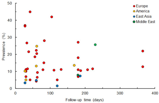 Figure 2 shows the prevalence of persistent gustatory dysfunction in COVID-19 survivors who were followed up for 28–365 days after symptom onset, hospital admission, or disease diagnosis. Gustatory dysfunction can persist for more than a few months with prevalence ranging from 1.6% to 45%, irrespective of geographical or ethnic differences. Gustatory dysfunction persisted in 13.6 ± 11.9% (mean ± SD) of COVID-19 survivors at 29.7 ± 2.1 days follow-up (in 13 studies), 13.8 ± 7.9% at 60.4 ± 2.1 days follow-up (in 9 studies) and 12.7 ± 7.4% at 181.9 ± 3.2 days follow-up (in 7 studies). Moraschini et al. [119] analyzed 8 observational studies to verify the long-term effects of COVID-19 and demonstrated that 14.1% of the subjects have ageusia at mean 67 days follow-up. Even 365 days after symptom onset, gustatory and/or olfactory dysfunction was reported by 12.7–22.0% of COVID-19 survivors in Italian cohorts [107,108]. Ageusia, hypogeusia, and/or dysgeusia may possibly persist for one year after recovery from the disease.
