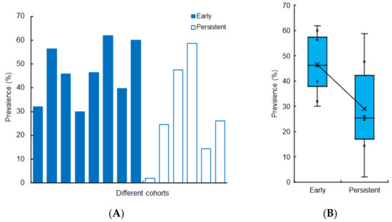 Figure 3A shows the prevalence of saliva secretory dysfunction in the early phase of COVID-19 and persistent saliva secretory dysfunction after recovery from COVID-19 in different cohorts. For assessing the symptom persistence, COVID-19 patients were followed up for 15–253 days after RT-PCR test negativity or hospital discharge. Prevalence (mean ± SD) was 46.5 ± 12.2% and 28.9 ± 21.0% for early and persistent saliva secretory dysfunction, respectively (Figure 3B). The prevalence of xerostomia was different during the active phase of COVID-19 and after the negative results of an RT-PCR test (p = 0.002, OR, 23.05; 95% CI, 2.9–182), as reported by Freni et al. [121].
