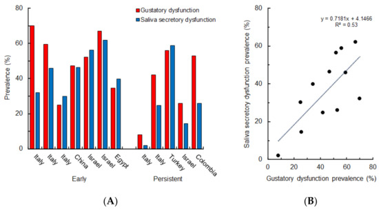 Out of 12 retrieved studies, 10 studies reported that COVID-19 patients and survivors complain of gustatory dysfunction together with saliva secretory dysfunction. Figure 4A shows the prevalence of both dysfunctions in the early phase of COVID-19 and at 15–253 days follow-ups after hospital discharge, RT-PCR test negativity, or symptom onset. Irrespective of geographical differences, early and persistent gustatory dysfunction can occur simultaneously with xerostomia, dry mouth, and/or hyposalivation. In an Israeli cohort consisting of 128 COVID-19 patients, the prevalence of gustatory dysfunction was correlated with that of dry mouth (p = 0.009) [42]. Egyptian COVID-19 patients also presented with both gustatory dysfunction and dry mouth [126]. Ageusia and xerostomia were reported by 53.0% and 26.0% of Colombian COVID-19 survivors, respectively, after a median of 219 days from symptom onset [127].