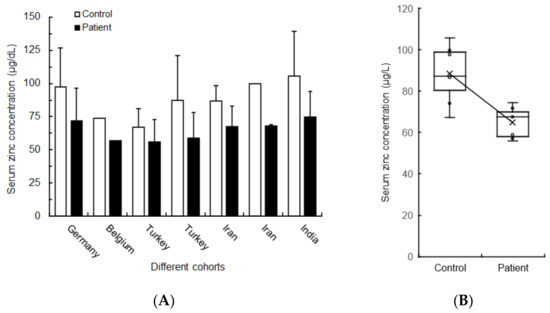 Figure 5A shows the quantitative results of zinc concentrations in serum obtained from COVID-19 patients and healthy subjects (or controls) in different cohorts [135,136,137,141,145,146,148]. Serum zinc concentration (mean ± SD) was 64.8 ± 7.5 μg/dL and 88.3 ± 14.0 μg/dL for COVID-19 patients and controls, respectively, indicating a significant difference between the two groups (p < 0.01) (Figure 5B).