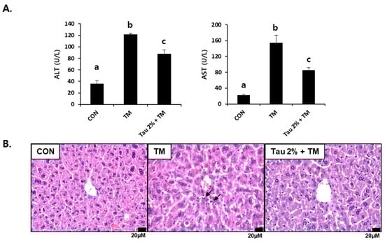 Effect of taurine on tunicamycin (TM)-induced hepatotoxicity. (A) Serum activities of alanine transferase (ALT) and aspartate aminotransferase (AST) in mice. (B) Histopathological examination of hematoxylin and eosin (H&E)-stained liver tissues at 72 h after TM treatment. Values are represented as the mean ± SD. Values with different letters (a, b, c) are significantly different from one another at p < 0.05 (one-way ANOVA followed by Newman-Keuls test). Arrows indicate inflammatory cells.