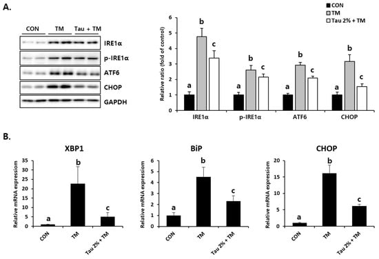 Effect of taurine on TM-induced ER stress in the livers. (A) Protein levels of IRE1α, phospho-IRE1α, ATF6, and CHOP (Whole blot images can be found in Figure S1). (B) XBP1, BiP, and CHOP mRNA expressions. Values are represented as the mean ± SD. Values with different letters (a, b, c) are significantly different from one another at p < 0.05 (one-way ANOVA followed by Newman-Keuls test).