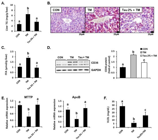 Effect of taurine on tunicamycin (TM)-induced lipid accumulation and the protein level of lipid transporter in the livers. (A) Levels of triglyceride (TG) in the homogenates of the liver. (B) Oil Red O staining in the liver. (C) Hepatic free fatty acid level. (D) Hepatic protein level of CD36 in the livers was determined by western blot analysis, and the levels of protein was normalized to that of GAPDH (Whole blot images can be found in Figure S2). (E) mRNA expression of microsomal triglyceride transfer protein (MTTP) and apolipoprotein B (ApoB). (F) Blood very-low-density lipoprotein (VLDL) level. Values are represented as the mean ± SD. Values with different letters (a, b, c) are significantly different from one another at p < 0.05 (one-way ANOVA followed by Newman-Keuls test).