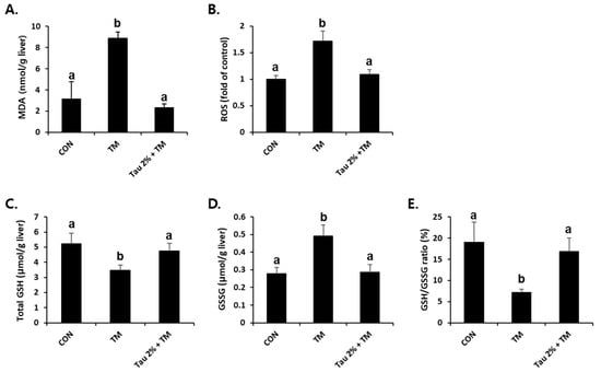 Amelioration of tunicamycin (TM)-induced oxidative stress in the livers by taurine treatment. (A) Malondialdehyde (MDA) levels in the livers were measured to assess lipid peroxidation. (B) Reactive oxygen species (ROS) generation, (C) total glutathione (GSH), (D) oxidized GSH (GSSG), and (E) GSH/GSSG ratio were measured in the liver tissues at 72 h after TM treatment. Values are represented as the mean ± SD. Values with different letters (a, b) are significantly different from one another at p < 0.05 (one-way ANOVA followed by Newman-Keuls test).