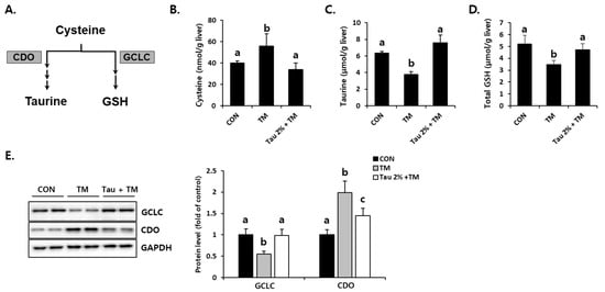 Effect of taurine pre-treatment on tunicamycin-induced abnormal cysteine catabolism in the liver. (A) Cysteine catabolism in the liver. (B) Hepatic cysteine. (C) Hepatic taurine (Tau). (D) Hepatic total GSH. (E) Protein levels of rate-limiting enzymes for GSH and taurine synthesis, GCLC and CDO, respectively (Whole blot images can be found in Figure S3). Hepatic substances and proteins were determined at 72 h after TM treatment. The levels of proteins were normalized by that of GAPDH. Values are represented as the mean ± SD. Values with different letters (a, b, c) are significantly different from one another at p < 0.05 (one-way ANOVA followed by Newman-Keuls test).