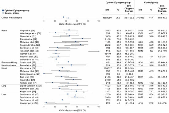| n/N | CMV Infection Rate, % (95% CI) | n/N | CMV Infection Rate, % (95% CI) | ||