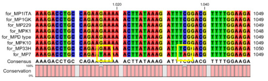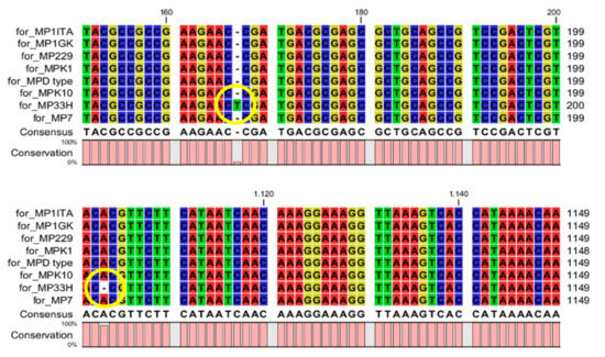 Nucleic sequence alignment appeared in the M. persicae clone 33H two frameshift mutations (shown by the yellow circles) occurring, respectively, in portion 150–200 and 1100–1149 of the Mpfor gene.