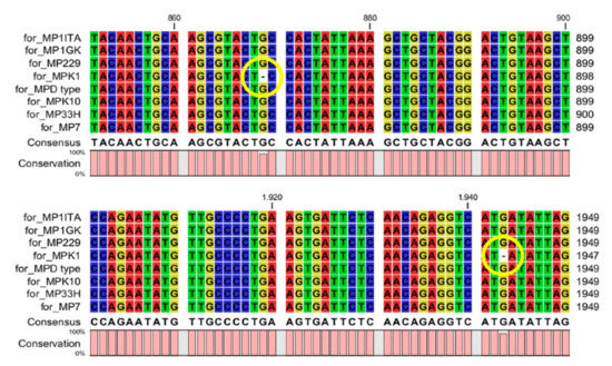Nucleic sequence alignment evidenced in the M. persicae clone K1 two frameshift mutations (shown by the yellow circles) occurring, respectively, in portion 850–899 and 1900–1949 of the Mpfor gene.