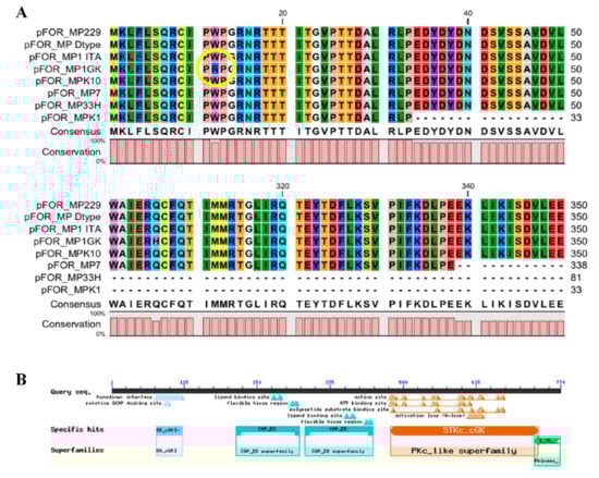 Protein sequence alignment evidenced in the M. persicae clone 1GK a missense mutation (A) (shown by the yellow circle), but the coded protein possessed both the conserved domains and active sites typically present in functional foraging proteins (B). Conserved domains are visualized in the line labelled “Specific Hits”, whereas “Superfamilies” represent the cluster of evolutionary conserved domains identified in the coded foraging proteins (labelled as “Query Seq”).