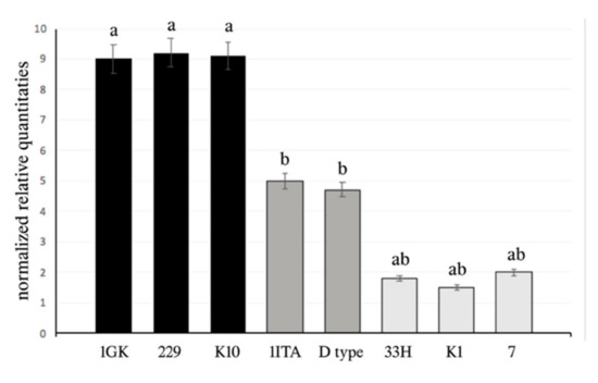 Normalized relative quantitative expression of for genes coding evidence high for expression level in clones 1GK, 229 and K10, whereas expression was scarce in the other clones and very low in clones 33H, K1 and 7, possessing severe mutations in the coding sequence. Bars indicate standard errors.