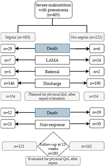 We found 405 children from the primary/index cohort who were hospitalized for severe malnutrition and pneumonia. During hospital course, 183 had sepsis and 222 had no sepsis. Among them, 29 and 6, respectively, died in the hospital. Another 34 children required either referral to another hospital or left against medical advice. At discharge from the hospital caregivers of 370 children were counseled to visit the nutrition follow-up unit (NFU) at a pre-scheduled interval. Among them, 56 did not visit NFU for further follow-up and 31 died at home. Finally, 283 children came for NFU, among them 121 from the sepsis group and 162 from the non-sepsis group (Figure 1). These 283 children constituted our study participants for whom we aimed to explore the physical QoL after sepsis. Physical QoL was assessed from available information at 12 weeks of follow-up.