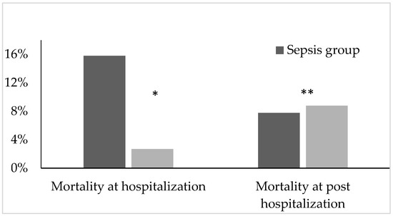 Distribution of mortality between the sepsis and non-sepsis groups both at hospitalization (* p < 0.001) and post-hospitalization follow-up (** p = 0.878).