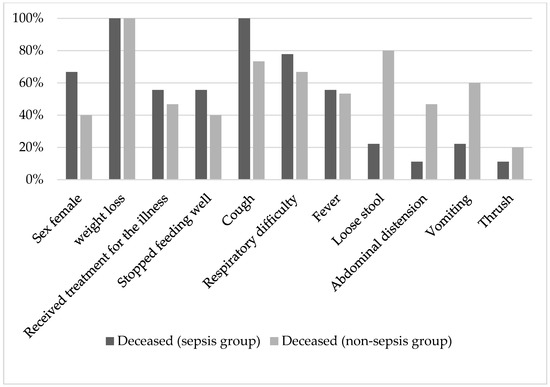 We evaluated the children who died after discharge from the hospital by doing a verbal autopsy where the caregivers of the deceased were asked several questions. The participation was voluntary, and we recorded a response rate of 77% (24 out of 31 deaths). The median time gap between discharge and death was 28 days (IQR: 10, 37.5) and 17 days (IQR: 4, 24), respectively, for the sepsis and non-sepsis groups. During post-hospitalization life, a verbal autopsy revealed most of the children from the sepsis survivor group had respiratory complaints before fatality, whereas gastrointestinal complaints were more common among the non-sepsis survivor group. Most of the children did not receive any treatment before their death, and all lost weight. Among the deceased, females were predominant (Figure 3).