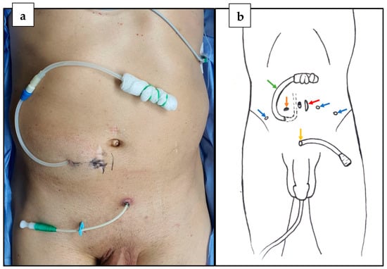 (a) Preoperative state. (b) Positioning of trocars during LRP vs. peritoneal catheter. Red arrow—12 mm optical trocar; blue arrows—5 mm trocars; orange arrow—10 mm trocar; green arrow—CAPD catheter (intraabdominal part marked with dashed lines); yellow arrow—cystostomy (graphic author: A.W.).