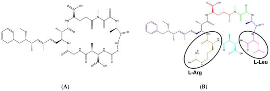 Structure of Microcystin and Microcystin-LR. (A) General structure of Microcystin with X and Y as variable amino acids at positions 2 and 4, respectively; (B) Structure of Microcystin-LR where L stands for L-Leucine and R represents L-Arginine.